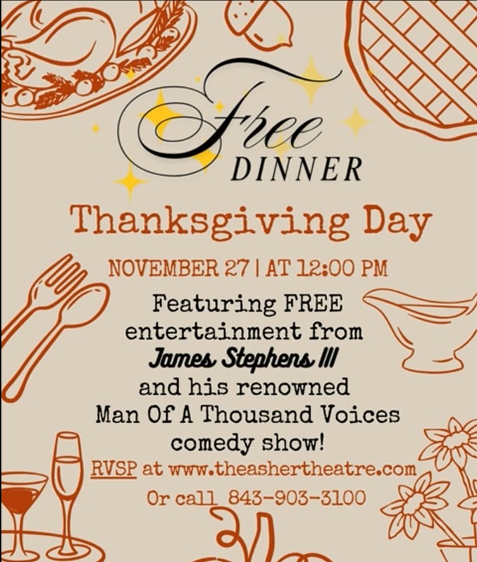 Join us for a FREE Thanksgiving Dinner right here at The Asher from 12:00pm to 2:00pm on Thanksgiving Day! Feast on food prepared by our personal chef and feast your ears on entertainment from our very own James Stephens III performing features from his Man Of A Thousand Voices show! Stay tuned for our special Thanksgiving Day Dinner Menu! Please be sur to RSVP to reserve your spot.